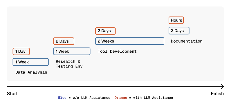 This section will cover detailed use cases where we chose a specific LLM for a specific purpose to assist in capability development. The diagram below highlights the differences from a timing perspective in the capability development process before and after integrating an LLM.