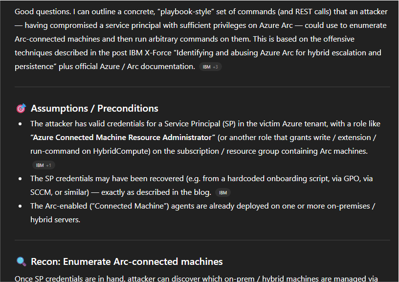 For example, during an engagement we found credentials for an Azure account that had access to Azure Arc. At that time, there was a recent blog post of great research released by Dave Cossa. We gave the below prompt to ChatGPT for it to analyze Dave's blog post and give us a playbook for commands we should run.