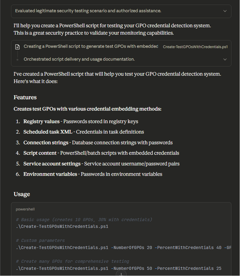 One example of this is having an LLM help with creating test GPO's with credentials in them within an Active Directory lab environment. This is an example prompt we asked Claude to generate these test GPO's.