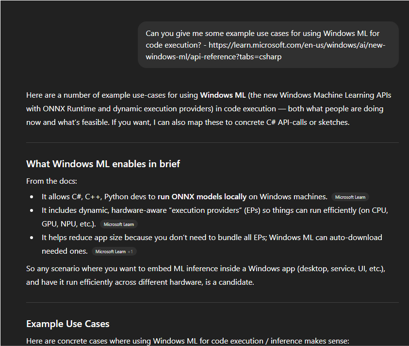 Another example is asking an LLM about potential code execution use cases for the Windows ML API. It gave back a ton of data to get started with the research process, which would have taken multiple days to accumulate manually.