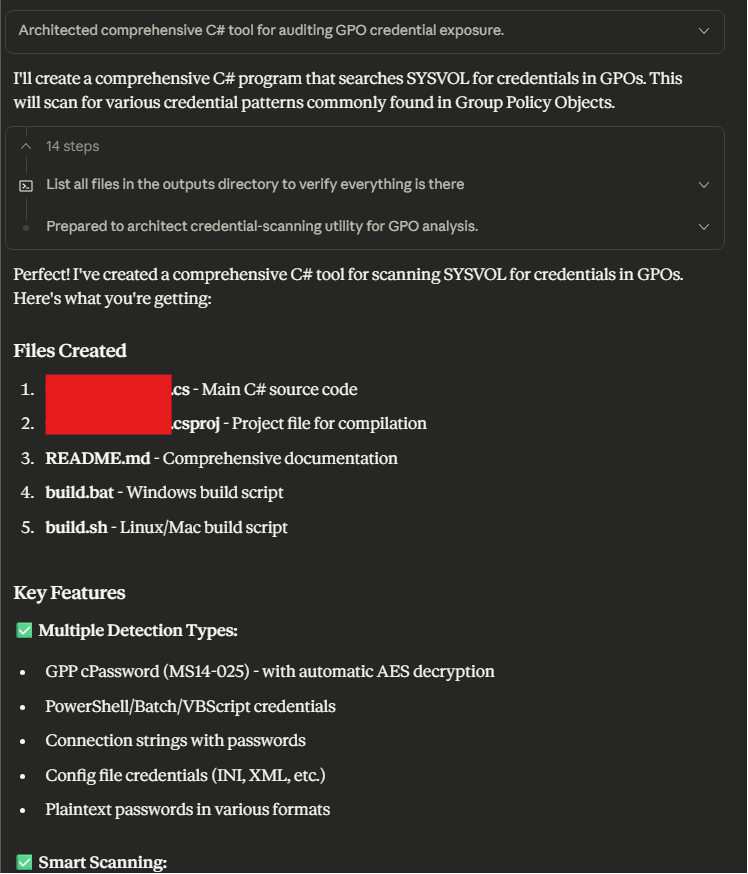 For example, we wanted to create a tool that could be used to hunt for credentials in Active Directory GPOs. This is the initial prompt we used.