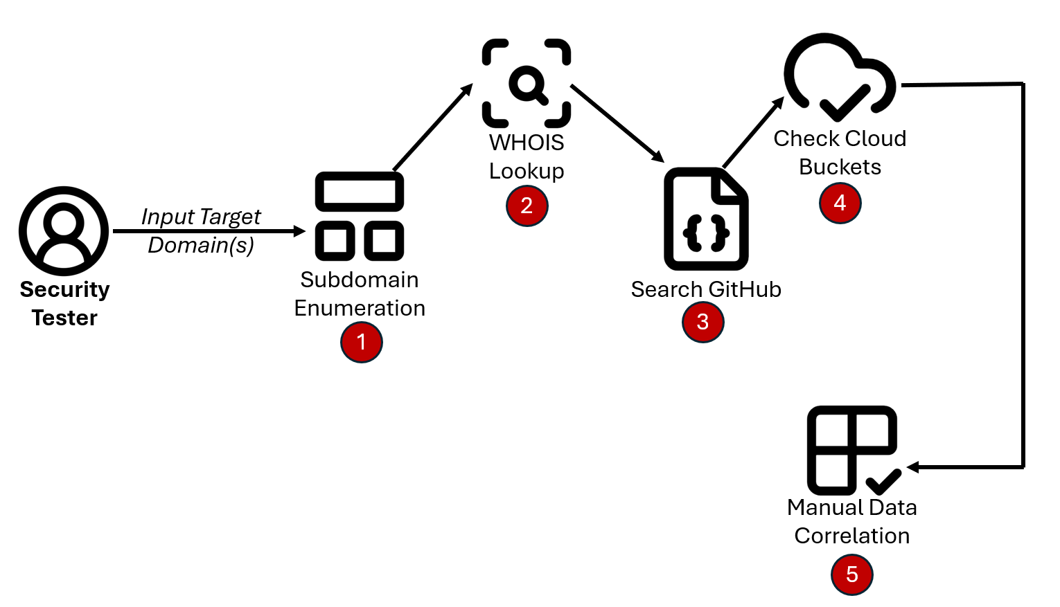 The traditional approach of passive external reconnaissance involves tooling being run in a silo and then attempting to correlate that data manually. This can be very time consuming and for large organizations can prohibit complete attack path and data coverage.