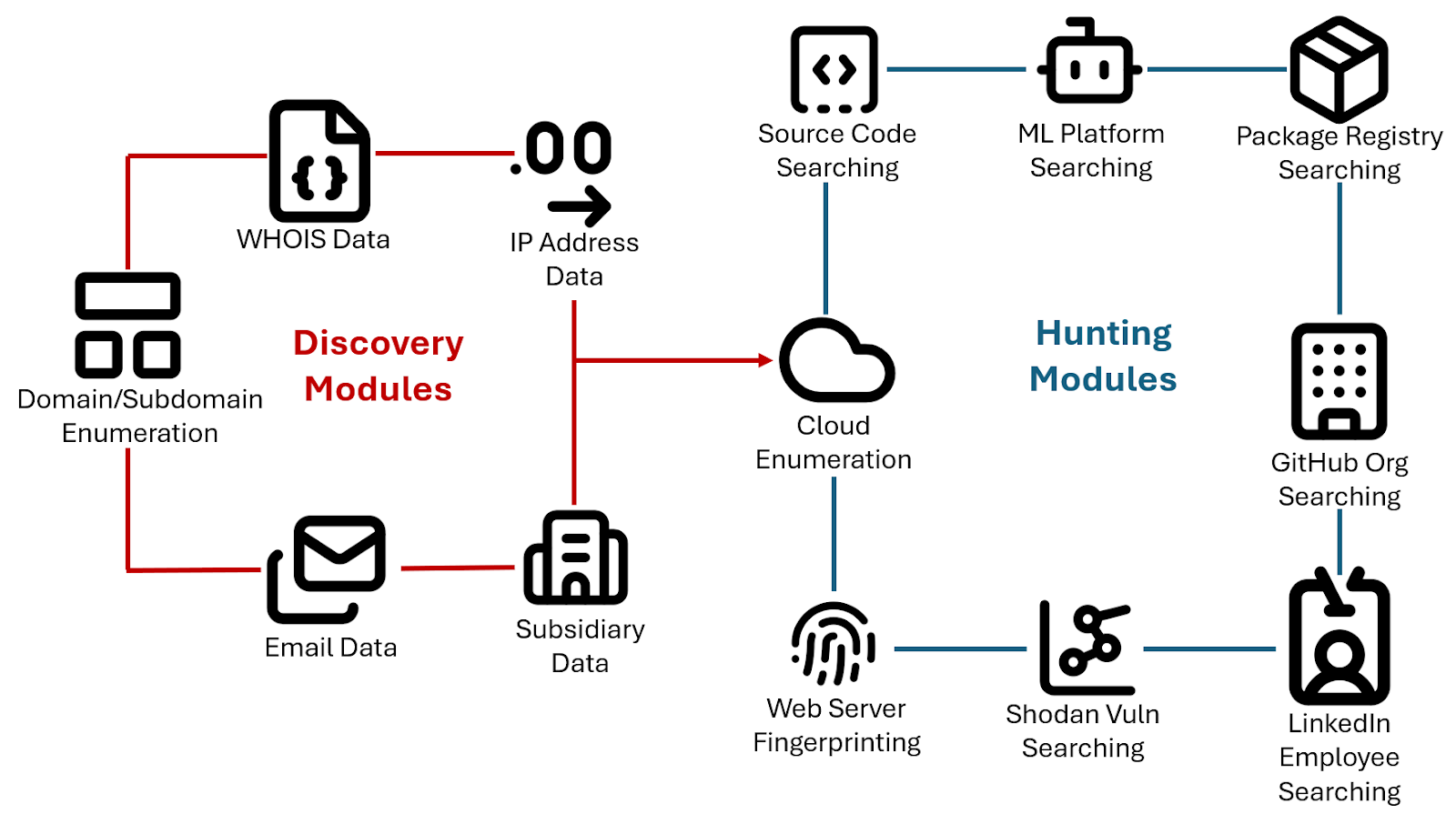 There are lots of great external reconnaissance frameworks out there such as bbot and Sublist3r. These are tools that have been used by offensive security professionals for many years prior to the popularity of LLM use in offensive security. We sought a modular, passive external recon framework with bidirectional data sharing. This design enables an LLM to correlate data across modules and identify potential attack paths from an external vantage point.