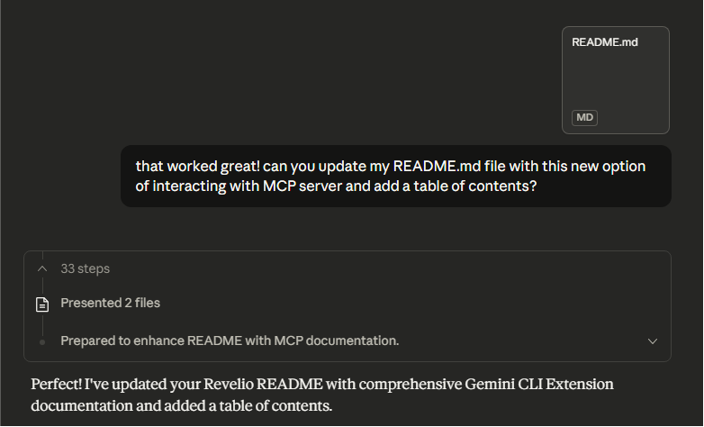 The part that everybody loves - documentation. Although this might not be everybody's favorite, it is the most critical part to ensure that a capability is used as part of offensive security engagements. However, this process can be sped up by using an LLM, especially documentation that is to be written in markdown. In this example use case we were developing an MCP server for our passive external recon framework. After adding new features, we asked Claude to update our README file, which it did very quickly.