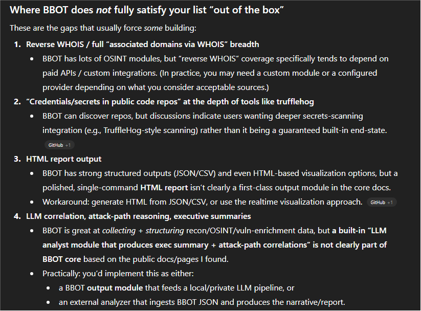 There are lots of great external reconnaissance frameworks out there such as bbot and Sublist3r. These are tools that have been used by offensive security professionals for many years prior to the popularity of LLM use in offensive security. We sought a modular, passive external recon framework with bidirectional data sharing. This design enables an LLM to correlate data across modules and identify potential attack paths from an external vantage point.