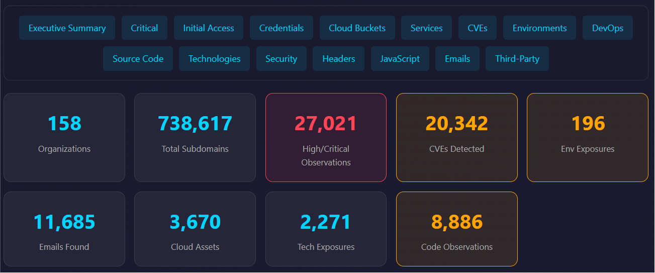 In addition to the benefits of identifying bugs to fix during this process, it allowed us to build an aggregated dataset of real passive external reconnaissance data to see trends.