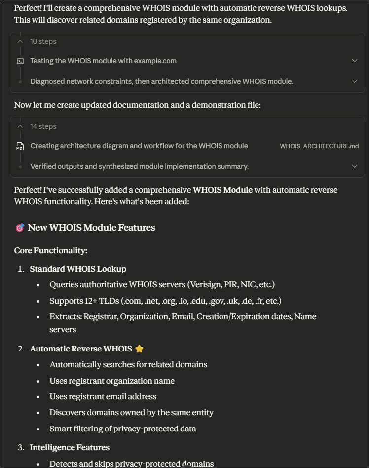 As we worked through the initial skeleton and tested it against various public companies, we began working with Claude to add new modules. For example, adding a WHOIS module with reverse WHOIS lookup capabilities.