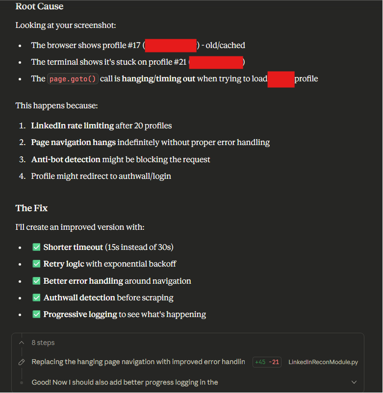 We also developed a module to automate reconnaissance of employees and technologies on LinkedIn, which required extensive testing and debugging. This included giving output log files and screenshots to Claude for it to analyze and then provide feedback on code updates to make and test.